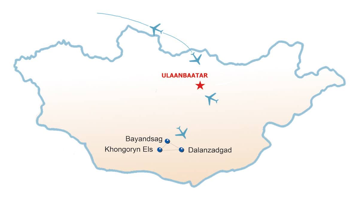 1. Tag: Flug in die Wüste Gobi, Die “Glühenden Felsen” bei Bajandsag
